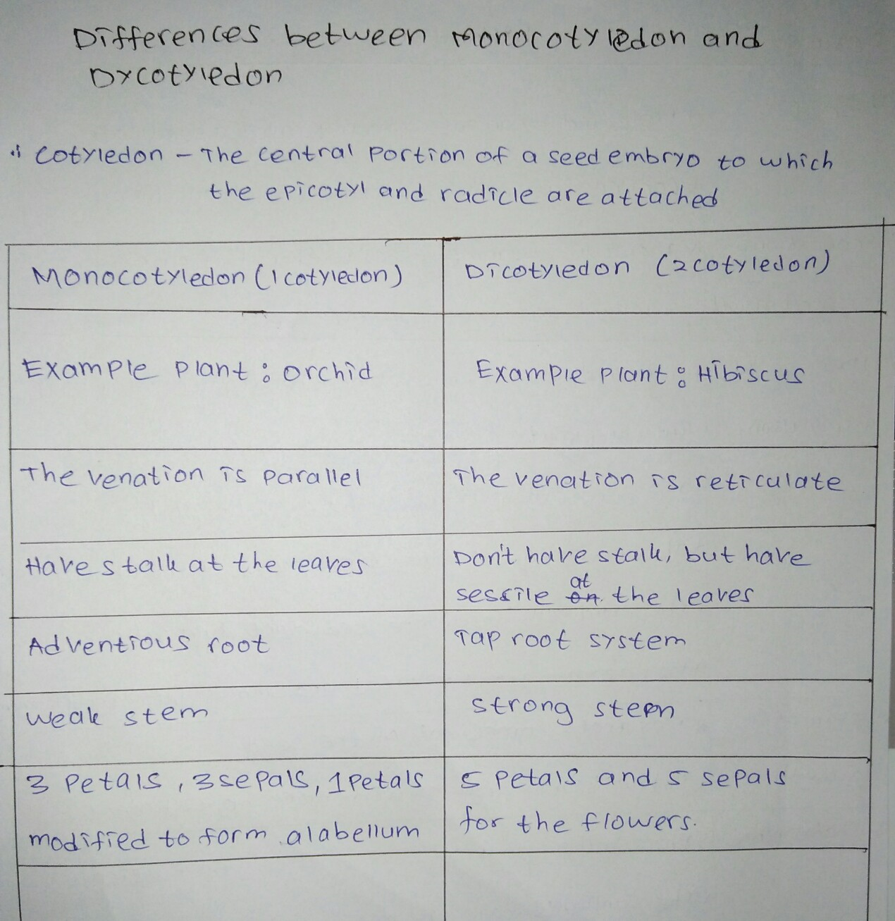 Write a note about monocotyledon and dycotyledon using your own note method and reason why you choose that method.